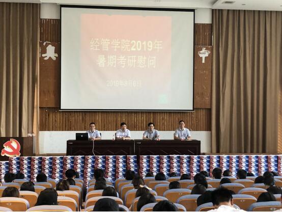 8月6日,经管学院在希望大道校区仁和楼报告厅集中慰问暑期留校复习考研同学,为同学们加油鼓劲。学院党委书记卜树春、副书记周旺基、学工办主任陈广正、团委副书记张成联和16级辅导员参加,院长助理李争光为同学们分析考研形势和指导暑期复习。