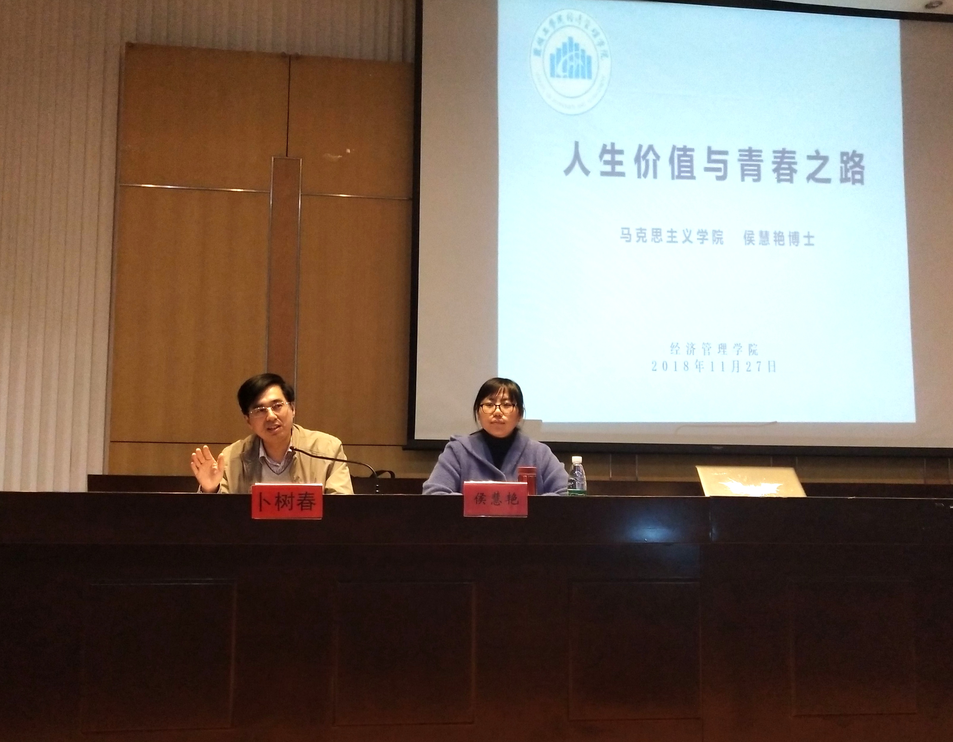 11月27日晚,经管学院三个学生党支部在北校区图书馆三楼报告厅集中上党课,马克思主义学院侯慧艳博士应邀作“人生价值与青春之路”主题党课。院党委书记卜树春主持,院团委、三个学生党支部负责人出席,学生党员、新生学生干部300余人参加。
