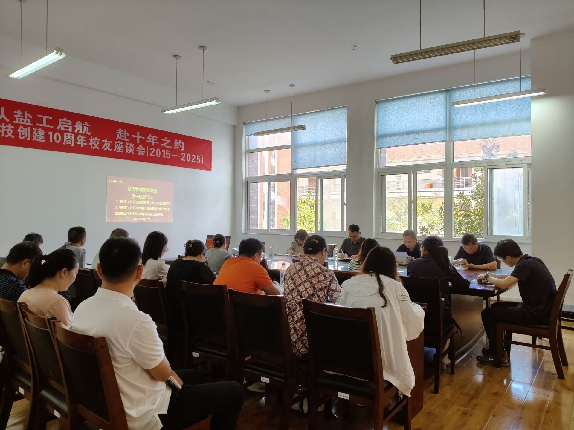 9月22日上午,在仁和楼B202会议室,经济管理学院党委会“第一议题”学习习近平在金砖国家领导人线上峰会的讲话、习近平在纪念中国人民抗日战争暨世界反法西斯战争胜利80周年招待会上的讲话。党委书记陈阳主持,学院党委委员参加,专业系、教科研办、学科办、实验中心主任列席。