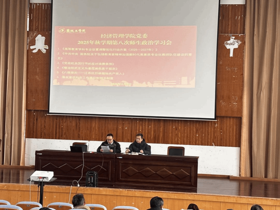 1月7日下午,经管学院在仁和楼报告厅召开经济管理学院党委2025年秋学期第八次师生政治学习会,学院党委书记陈阳主持,全体教职工参加会议。