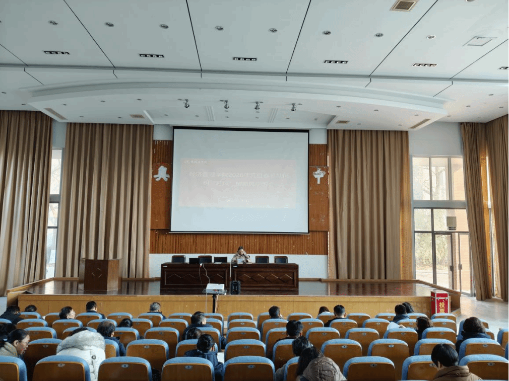 为持续深化作风建设,营造风清气正的节日氛围,1月7日下午,经济管理学院在仁和楼报告厅召开2026年元旦春节期间“纠‘四风’、树新风”专题学习会。学院全体教职工参加会议,会议由党委书记陈阳主持。