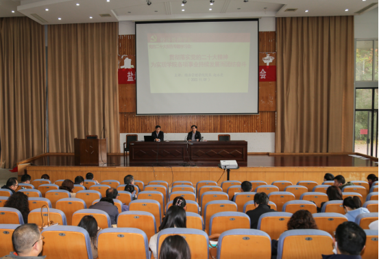 11月9日,经管学院在仁和楼报告厅举办党的二十大精神专题学习会,组织全院教职工学习贯彻习近平总书记代表第十九届中央委员会在党的二十大上作的题为《高举中国特色社会主义伟大旗帜为全面建设社会主义现代化国家而团结奋斗》报告精神,院党委委员、院长赵永亮讲党课,院党委书记卜树春主持。