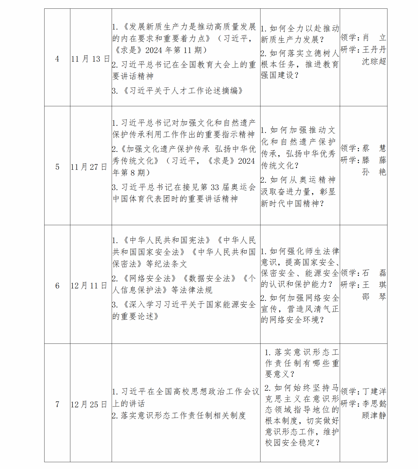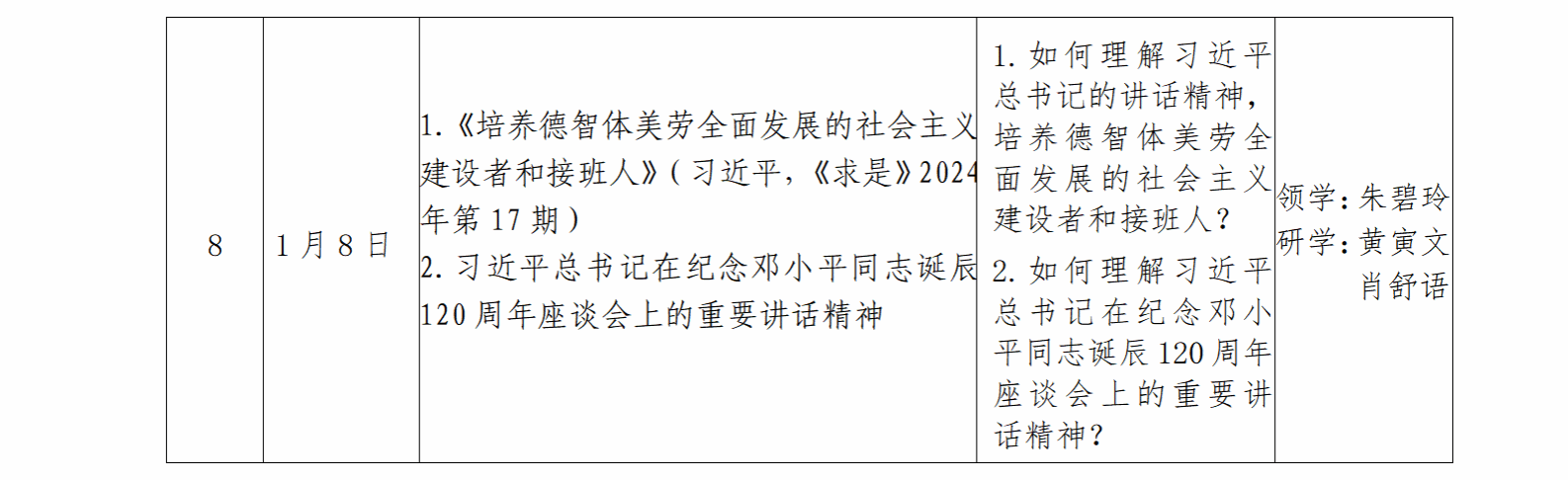 9.各党支部制订具体学习计划(含学习时间、学习地点、学习内容、领学人、重点发言人等,党支部书记主持和总结点评),以电子版形式报送院党委组织员朱碧玲老师留存备案。