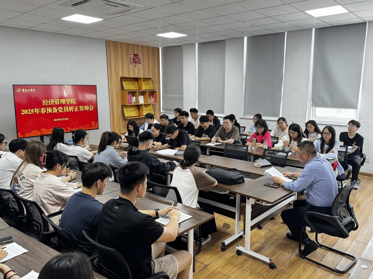 5月28日下午15:00,经济管理学院在希望大道校区仁和楼B502举办预备党员转正答辩会。学院党委副书记周旺基,学生党支部书记高加友、肖舒语、朱碧玲,支部委员沈琮超担任答辩评委,41名预备党员参加转正答辩会。