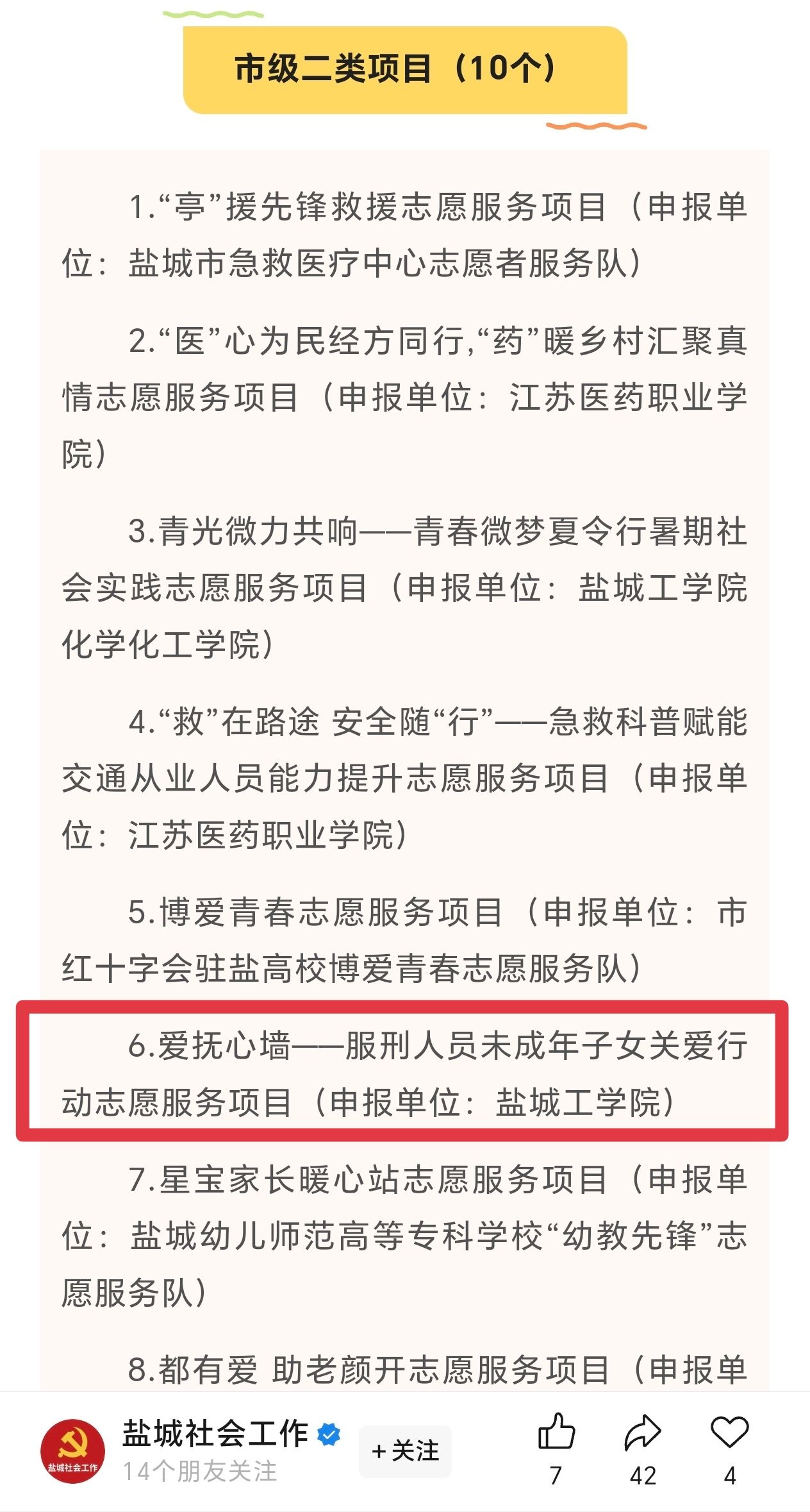 近日,江苏省高校红十字会“博爱青春”暑期志愿服务项目综合评审结果正式公布。经济管理学院申报的“爱抚心墙—服刑人员未成年子女关爱行动”志愿服务项目,在全省127所高校的330个参评项目中脱颖而出,以第14名的优异成绩获评“银奖项目”,同时获评2025年度盐城市新时代志愿服务“市级二类项目”。
