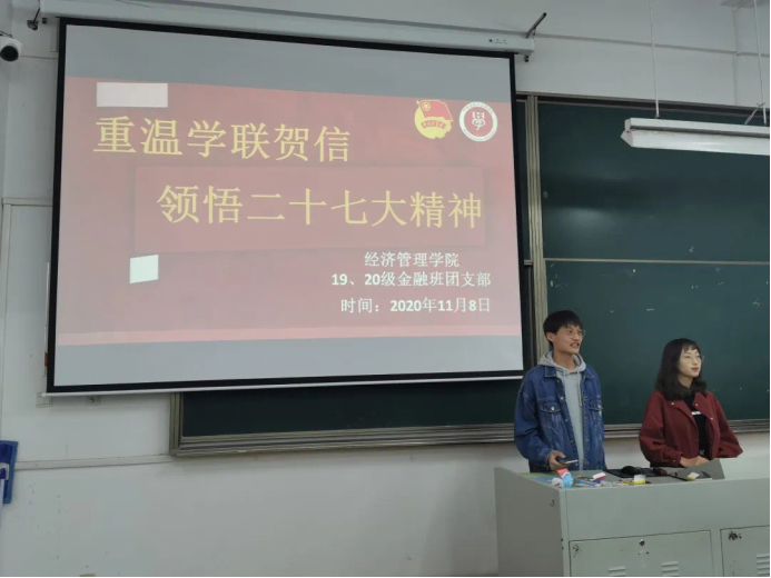 为更精确传达全国学联二十七大的会议精神,11月8日晚上19:00,经管学院19级和20级金融专业四个团支部同学在知达楼3J2C102教室召开“重温学联贺信,领悟二十七大精神”主题梦想公开课,共同学习本次学联二十七大会议内容。本次团日活动由B金融201团支书薛恬、B金融202团支书陈星雨主讲,19级团支书王语姗和刘沁分别做动员和总结,专职辅导员陈明明做指导。