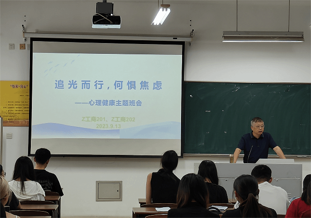 近日,经管学院组织2020-2022级所有班级集中开展“追光而行,何惧焦虑”心理健康主题班会,就大学生焦虑问题开展主题教育,全体专兼职辅导员担任主题班会的主持人。