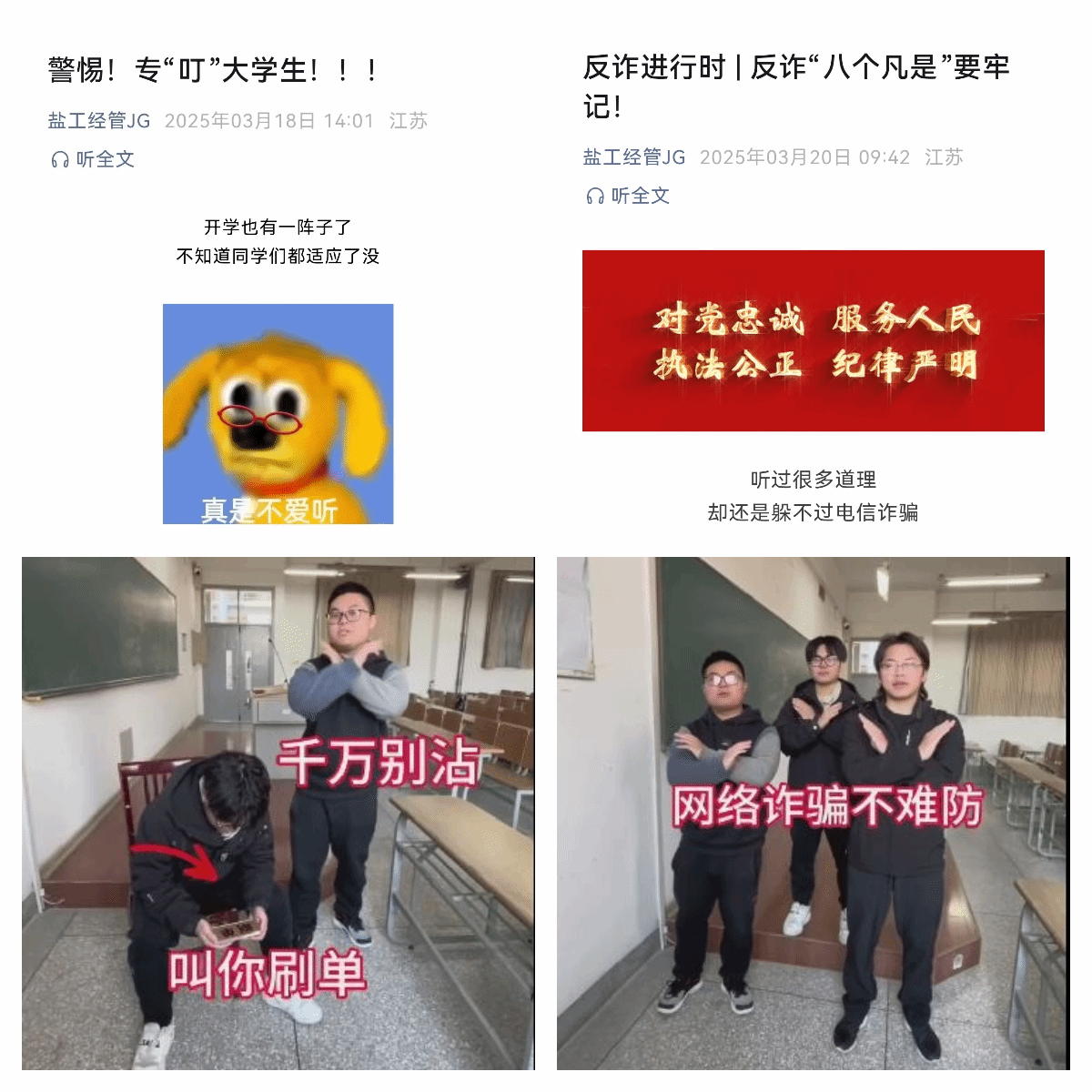 打造"线上+线下"立体传播矩阵,“盐工经管JG”微信公众号开设反诈专栏“反诈进行时”,定期发布反诈内容。学生自编自导自演“防范诈骗”情景剧,以幽默演绎还原"冒充客服退款"等诈骗场景。组建反诈先锋队,发挥学生主动能动性,开展反诈知识竞赛以及PPT、征文、视频宣传比赛,评选优秀作品并予以表彰,推动宣传教育从"单向灌输"转向"双向互动"。