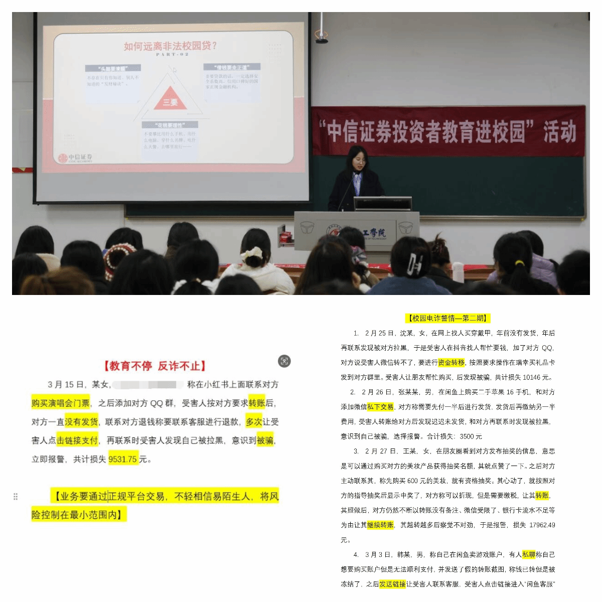 依托校企合作资源,邀请中信证券风控专家开展专题讲座,深度解读投资理财类诈骗新技术新手段,传授远离非法校园贷策略。建立警情通报机制,定期汇编学生受骗案例并标注高危信息特征,通过班级群、宣传栏定向推送预警提示,形成"以案为鉴"的动态教育模式。