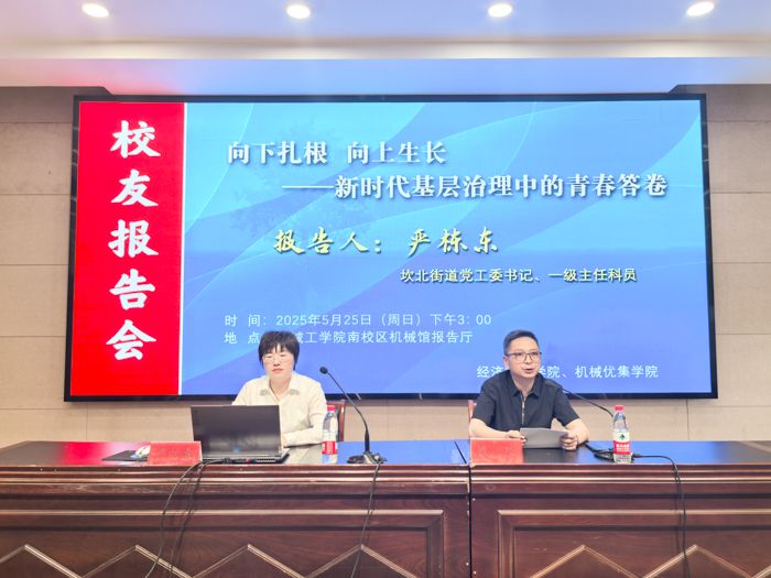 5月25日下午,我校工商管理专业2007届优秀校友、滨海县坎北街道党工委书记严栋东重返母校,在机械馆报告厅为师生作题为《向下扎根、向上生长——新时代基层治理中的青春答卷》的专题报告。机械优集学院副院长(主持工作)宦海祥、党委副书记阎小民出席,经济管理学院党委书记陈阳主持。机械优集学院、经济管理学院学生干部代表300余人参加。