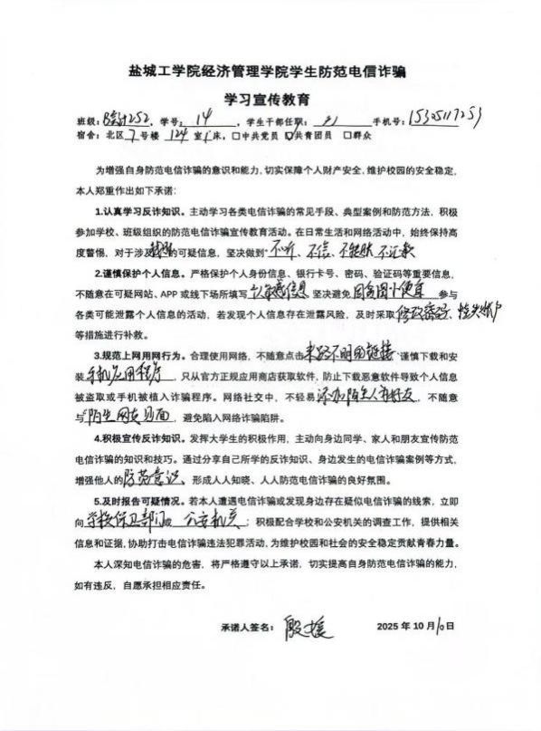 组织全院学生签署《防范电信网络诈骗承诺书》,强化学生的法治观念与责任意识,引导学生自觉抵制诈骗行为,筑牢思想与行为防线。