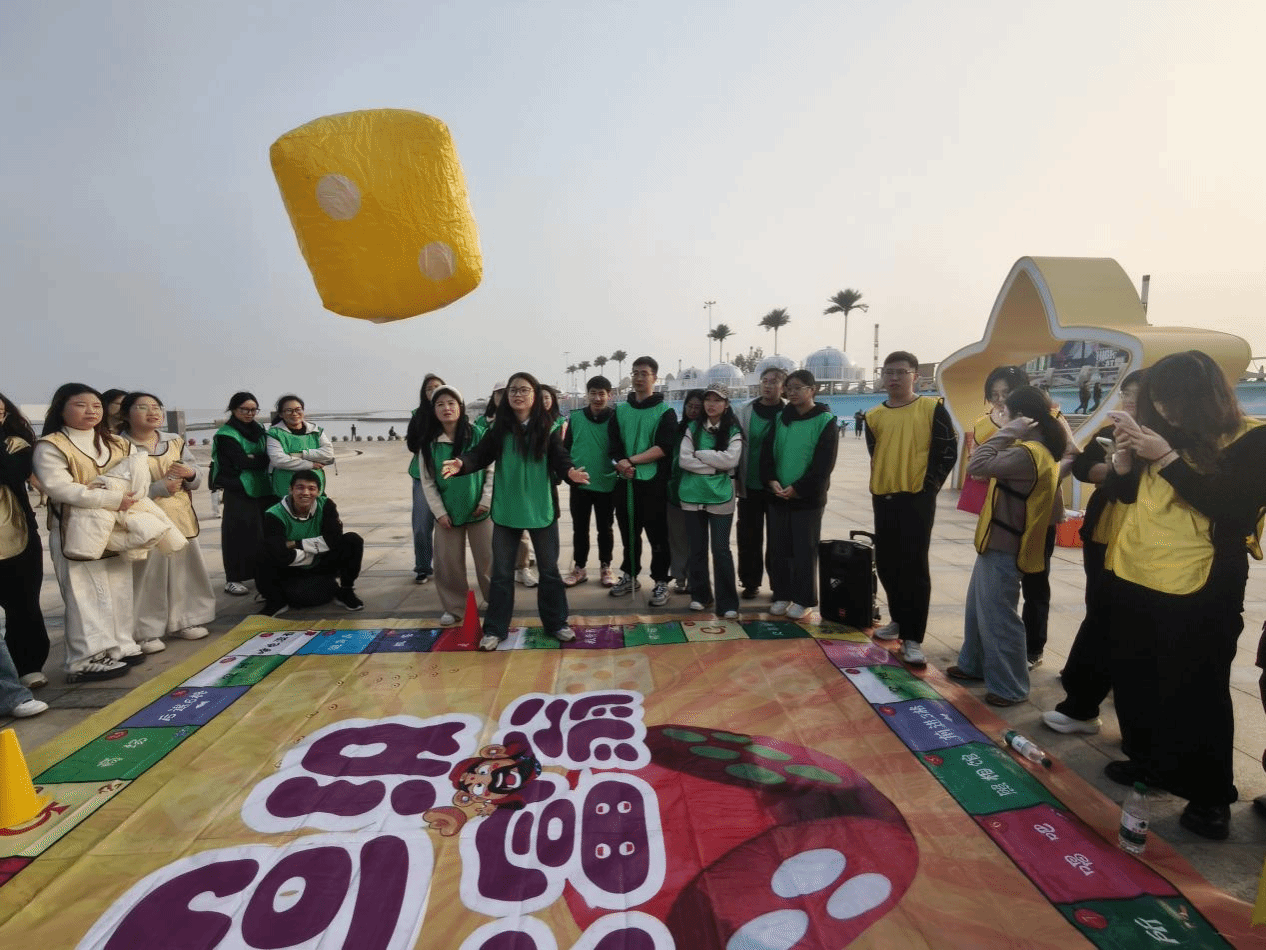 午餐后,师生们前往第二站滨海月亮湾。首先瞻仰了宋公堤,聆听红色故事,传承爱国情怀与红色精神。随后通过开展“真人大富翁”项目,四个队伍凭借2000元虚拟启动资金,通过掷骰子移动、完成任务、购买经营资产等环节展开比拼,在趣味互动中培养了策略思维与团队协作意识。