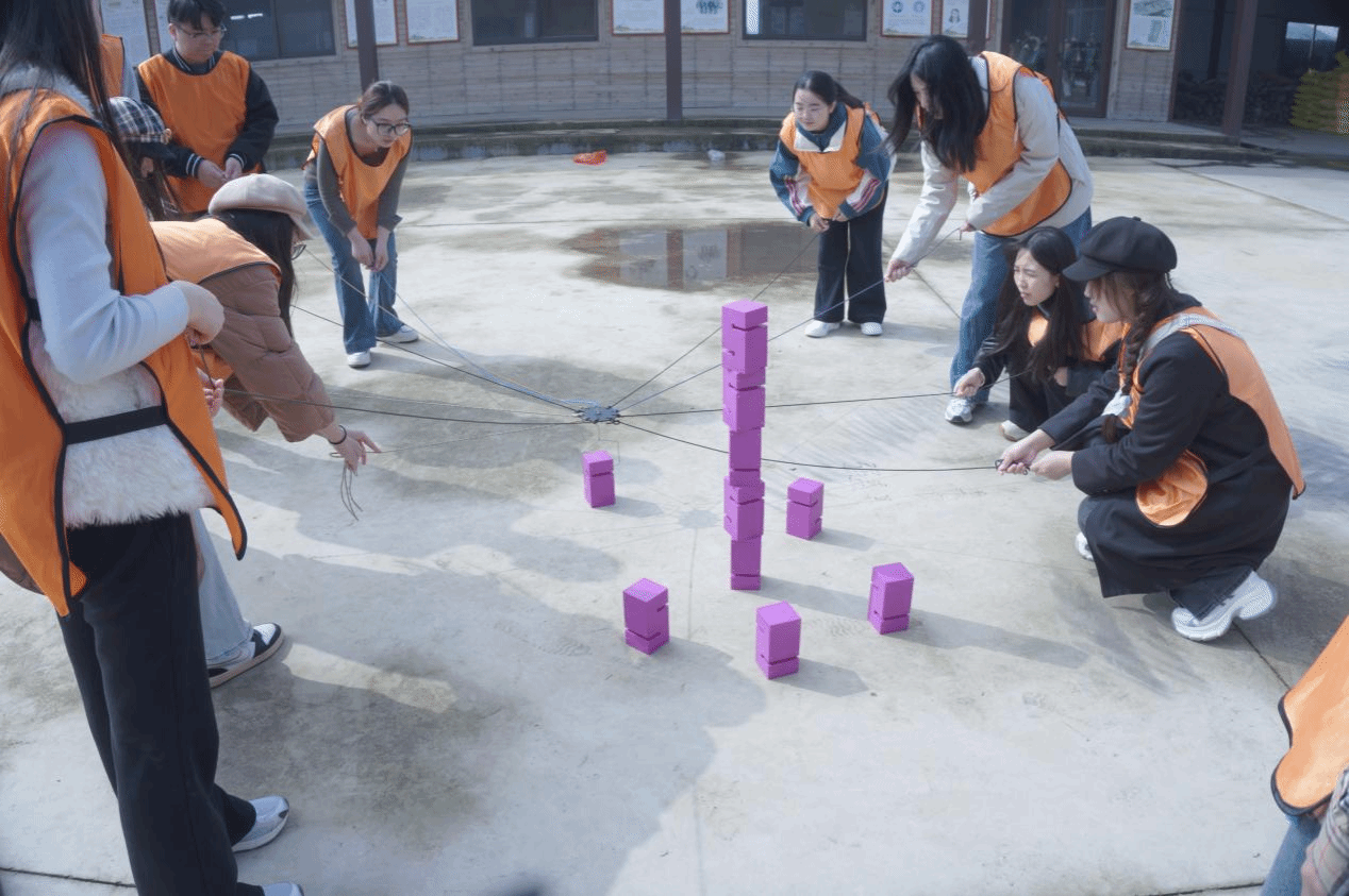 活动前期,经管学院精心规划路线与流程,途中师生们欢声笑语,为此次拓展活动奠定了轻松愉悦的基调。抵达首站老首乌生态园后,上午的活动正式拉开帷幕,通过设置“破冰+团队文化建设”环节,同学们打破隔阂,快速分组并推选队长,共同设计队名、队形、队徽与队歌,在互动中迅速建立信任。随后依次开展“合力筑塔”“极速60秒”“硕果累累”等三大主题项目。“合力筑塔”中,同学们拉紧绳头控制塔钩,统一指挥、分工协作完成模型搭建;“极速60秒”里,大家在规定时间内有序整理数字卡片,锻炼了沟通效率与全局观念;“硕果累累”项目通过竞猜水果的形式,进一步提升了团队应对挑战的能力。