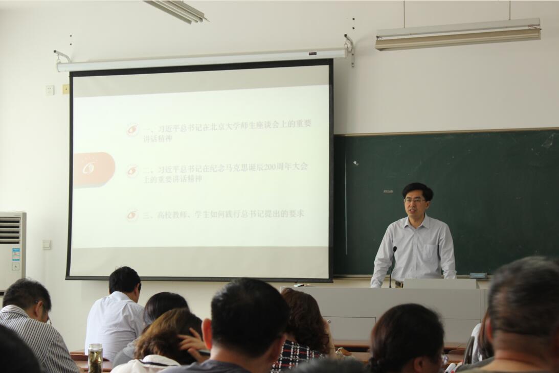 6月20日 下午,经管学院在仁和楼B406会议室举办“学习新思想,师生同上一堂课活动”,按照学校部署要求,学院党委书记卜树春为全院教师做题为《坚定理想信念,做新时代的奋斗者》主题报告,带领大家学习领会习近平在北京大学师生座谈会上的讲话精神、在纪念马克思诞辰200周年大会上的讲话精神。