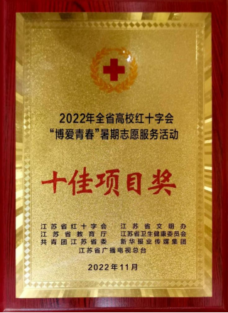 日前,经管学院代表学校在2022年江苏省高校红十字会“博爱青春”暑期志愿服务项目综合评审中,项目活动的影响力、创新性、实际成效等综合得分从全省118所高校的210个志愿服务项目中脱颖而出,荣获“十佳项目奖”。