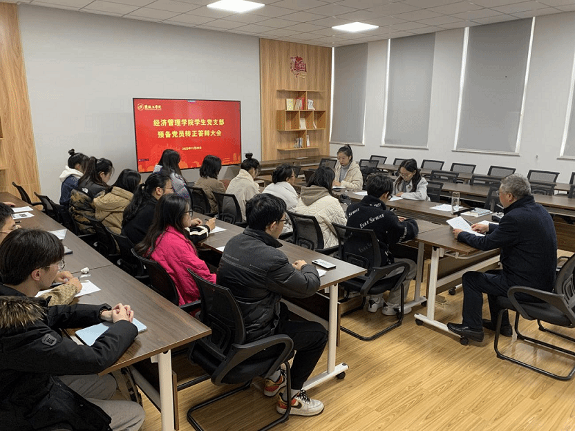 11月29日,经济管理学院党委在仁和楼B502举办预备党员转正答辩会。学院党委副书记、关工委秘书长周旺基,学生党支部书记高加友、朱碧玲、肖舒语担任答辩评委。