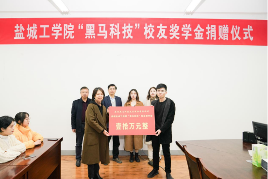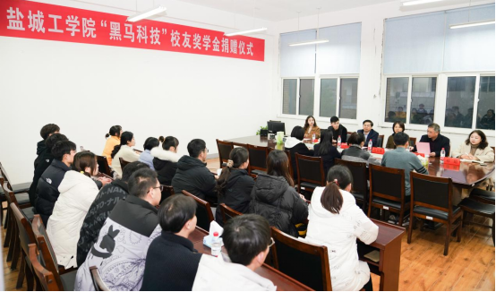 12月8日下午,盐城工学院“黑马科技”校友奖学金捐赠仪式在我校希望大道校区仁和楼B202会议室举行。经管学院2016届校友、盐城黑马科技发展股份有限公司董事长卓伟文委托总经理吴荣繁(经管学院2016届校友)、营销助理崔婷婷(经管学院2021届校友)出席捐赠仪式,校长办公室、校友工作办公室副主任赵文彬、校友工作科科长祁娟,经管学院党委书记卜树春等代表学校接受捐赠,经管学院学工办、团委、辅导员代表、学生代表30余人参加,学院党委副书记周旺基主持捐赠仪式。
